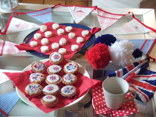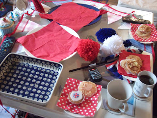 I’d had the keen help of Spike who made the Jam Pennies single handedly (top left in the image), and of course the red, white and blue pompoms, whilst I made the cucumber sandwiches, cupcakes and laid the table. King Julien and Tuna were busy finishing off their homework.