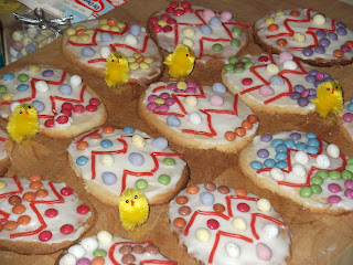 Tuna, Granny and I knuckled down and decorated the Easter Egg cookies late yesterday afternoon. These then dried overnight, ready for tying with ribbons and tags this morning, to then give away to Aunties and Uncles at lunch today. As promised, the Easter Egg cookies we baked up :