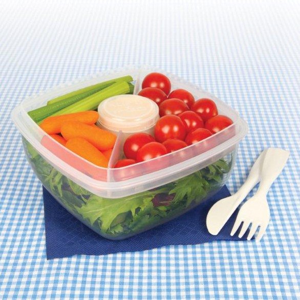 The Salad 2 Go solves the problem of the salad looking limp by lunch time. With 4 compartments on the top layer and a large lower area, keeping everything separate and crisp, plus a little sauce pot, you can assemble your salad just before eating. Again, the handy cutlery is tucked away in the lid, plus the lid has a seal to keep all the lunch items INSIDE the box!